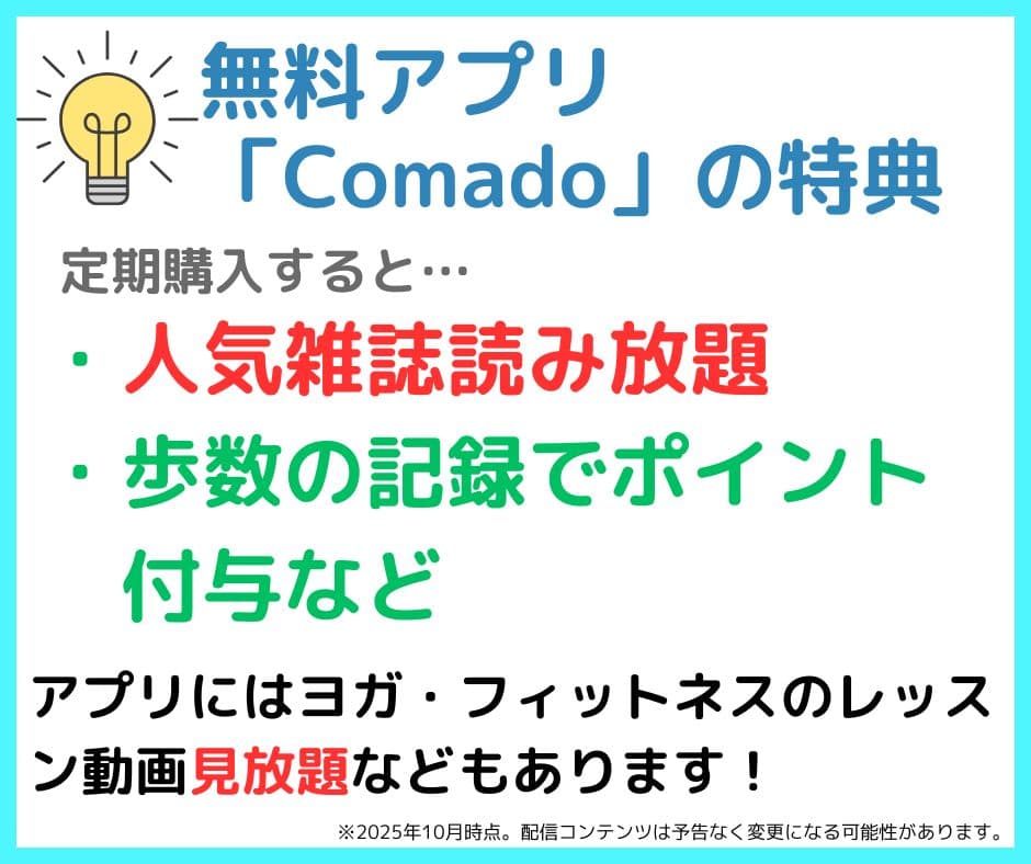 - Comadoアプリ登録で人気雑誌読み放題などの特典あり